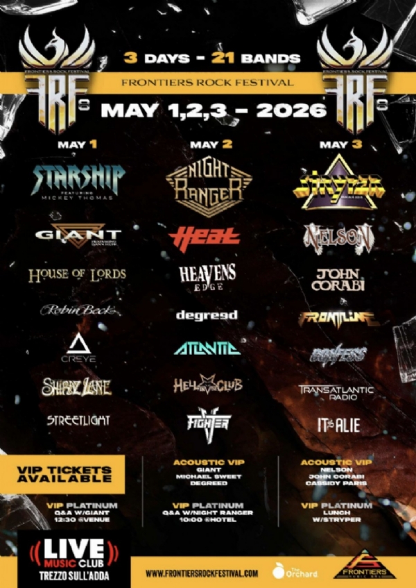 Following the recent announcement of GIANT's original lineup reunion, Frontiers Music Srl is pleased to reveal the full bill for the Frontiers Rock Festival 2026, with the final bands now confirmed for the event, set to take place on May 1, 2, and 3, 2026, at the Live Club in Trezzo sull'Adda (Milan), Italy.