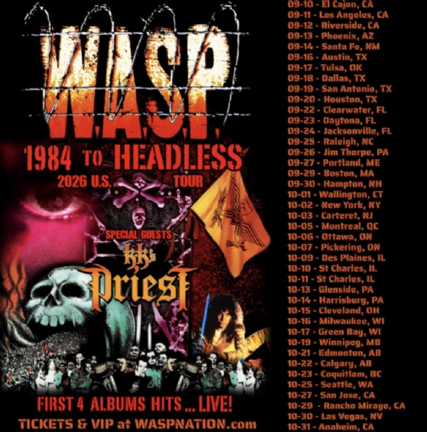 W.A.S.P. is excited to announce the "1984 To Headless" 2026 U.S. and Canada Tour with KK's Priest as very special guest. The tour kicks off on September 10 in CA and runs through October 31st. W.A.S.P. will be playing the hits from their first four albums.