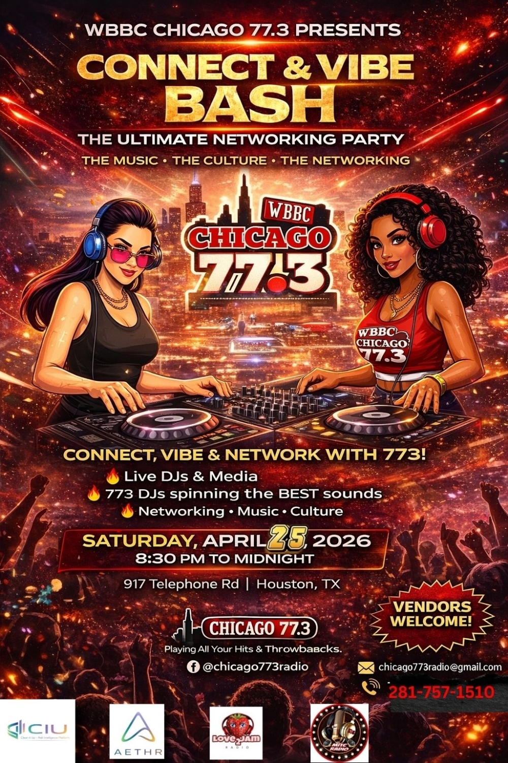 - Vibe: Live DJs, Media, and high-level networking. Vendors are welcome!