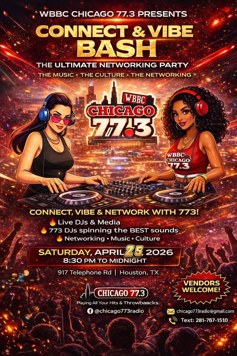 The ultimate networking party is taking over Houston! WBBC Chicago 77.3 presents the Connect & Vibe Bash at 917 Telephone Rd.