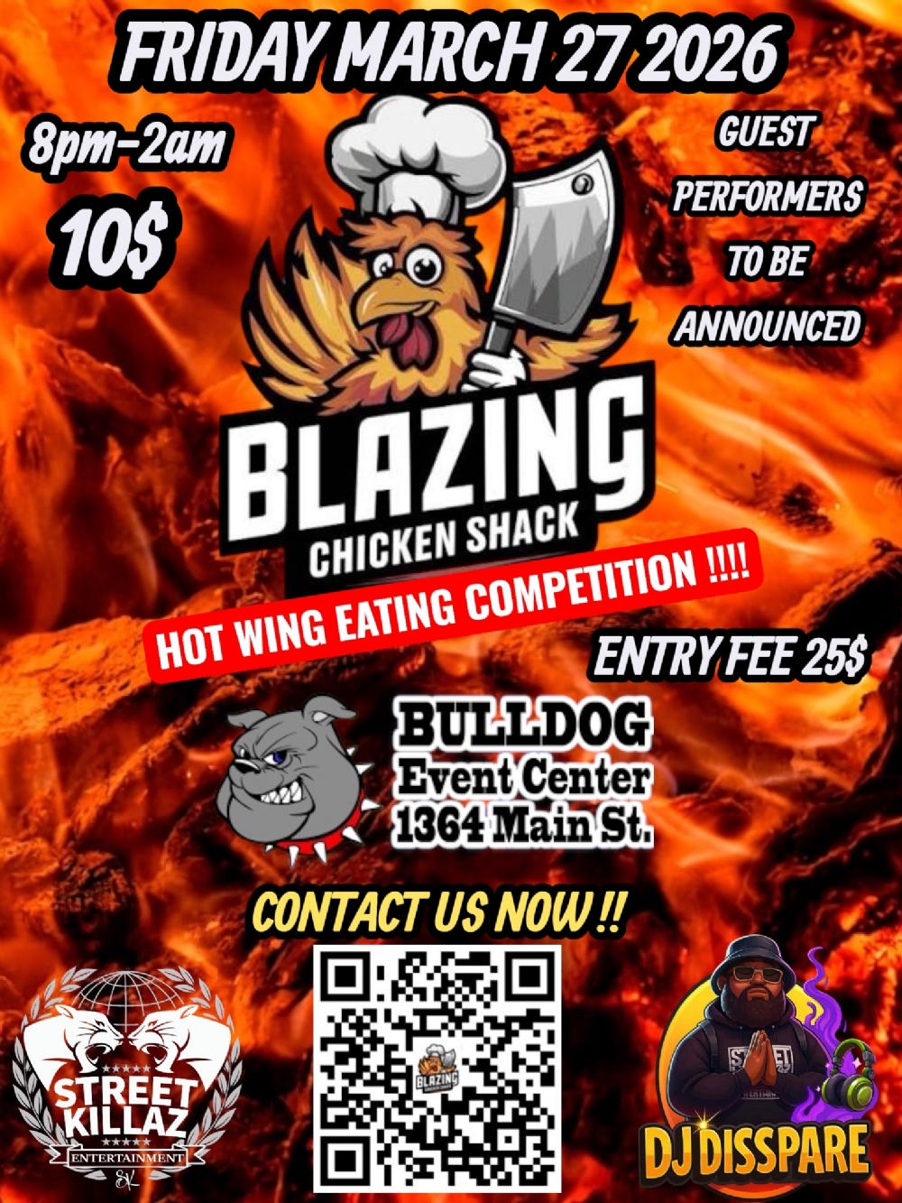 @blazing_chicken_shack HOT WING EATING COMPETITION !!!! @bulldogsonmain WITH SUPPORT FROM @streetkillazent & @djdisspare Get ready to turn up the heat at the Hot