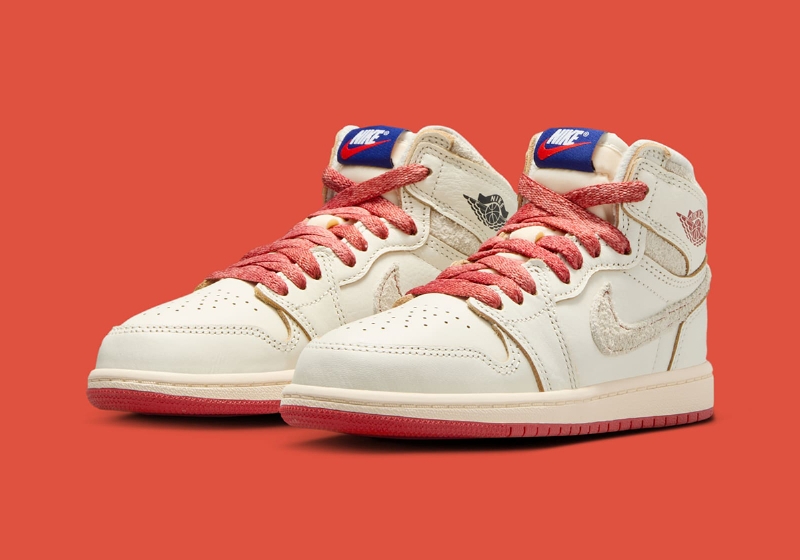 The sneaker features a sail leather upper with distressed suede accents on the collar and Swoosh. The faded red laces complement the deep cinnabar detailing on the Wings logo and outsole. A vintage-inspired midsole enhances the aged aesthetic. Exposed stitching and a deconstructed tongue complete the raw look. The sneaker removes the classic Nike Air branding, making it a unique take on the iconic Jordan 1.