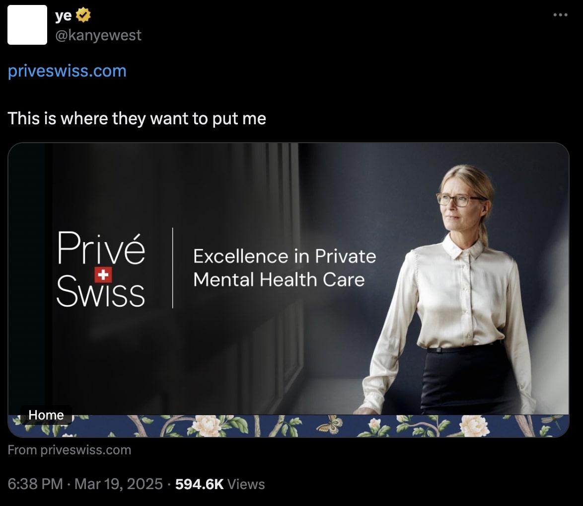After Kanye West's video, the rapper posted a link to a mental health care facility in Switzerland. "This is where they want to put me," he alleged. The paranoia was ratcheted up when he posted a screenshot of a text exchange with an unidentified number. West seemingly tells the contact he's been hearing knocks on his door. The contact then advised the rapper to travel to a hotel and "be careful for a couple nights." The warning is compounded by the contact alleging that people who work for "that family" work all over town. It's all very vague, making it unclear the legitimacy of Kanye West's concerns.
