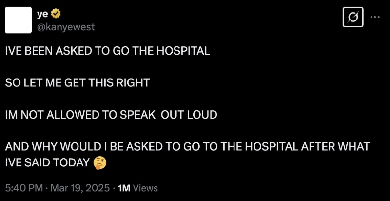 "I got knocks on my door," Kanye West said in a Twitter video. "Familiar faces saying, 'Hey, maybe you should come to a retreat.'" The rapper then inquired about the details of the retreat. He balked at the idea when he learned the truth. "Come to find out it's a hospital," he explained. "That's what happened a couple hours ago." Kanye West elaborated on this interaction via tweets. "IVE BEEN ASKED TO GO THE HOSPITAL," he wrote shortly before his video post. "SO LET ME GET THIS RIGHT. IM NOT ALLOWED TO SPEAK OUT LOUD. AND WHY WOULD I BE ASKED TO GO TO THE HOSPITAL AFTER WHAT IVE SAID TODAY."