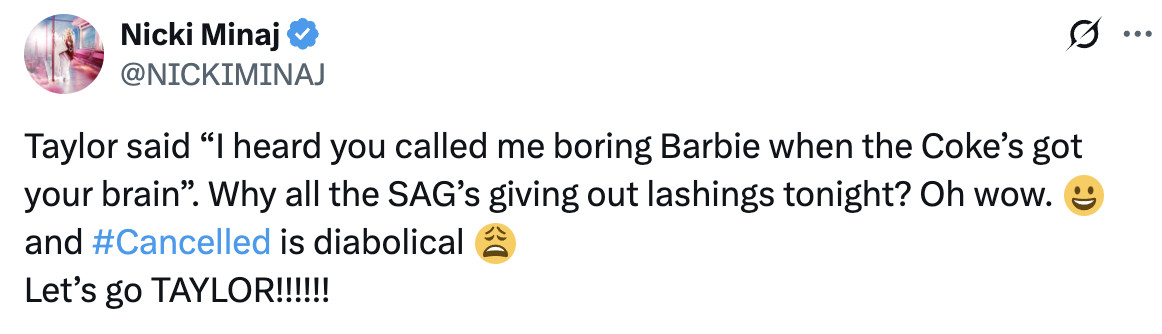 In December 2023, Nicki Minaj told a fan she'd collaborate with Taylor Swift "in a heartbeat."