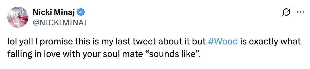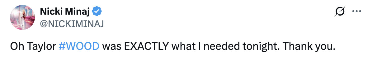 "Oh Taylor #WOOD was EXACTLY what I needed tonight. Thank you," Minaj tweeted. She followed up with, "lol yall I promise this is my last tweet about it but #Wood is exactly what falling in love with your soul mate 'sounds like'."