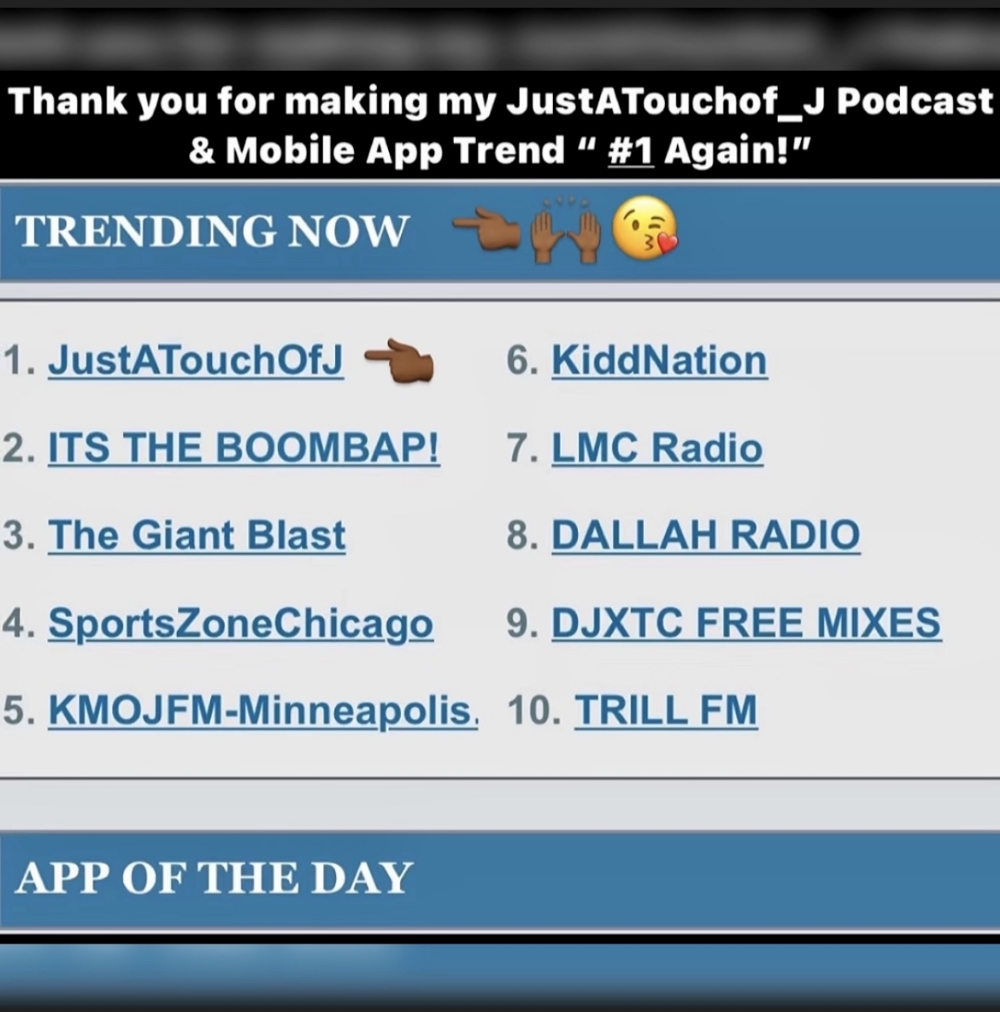 Don't forget that podcast and my JustATouchof_ J radio show episodes are being streamed on over 30 different podcast networks, in 150 different countries world wide. Including #anchorfm #iheartradio #pandora #spotify #applepodcasts #itunes and Amazon.com .. They're also available on all my social media platforms, and can also be heard on my mobile app for free as well.