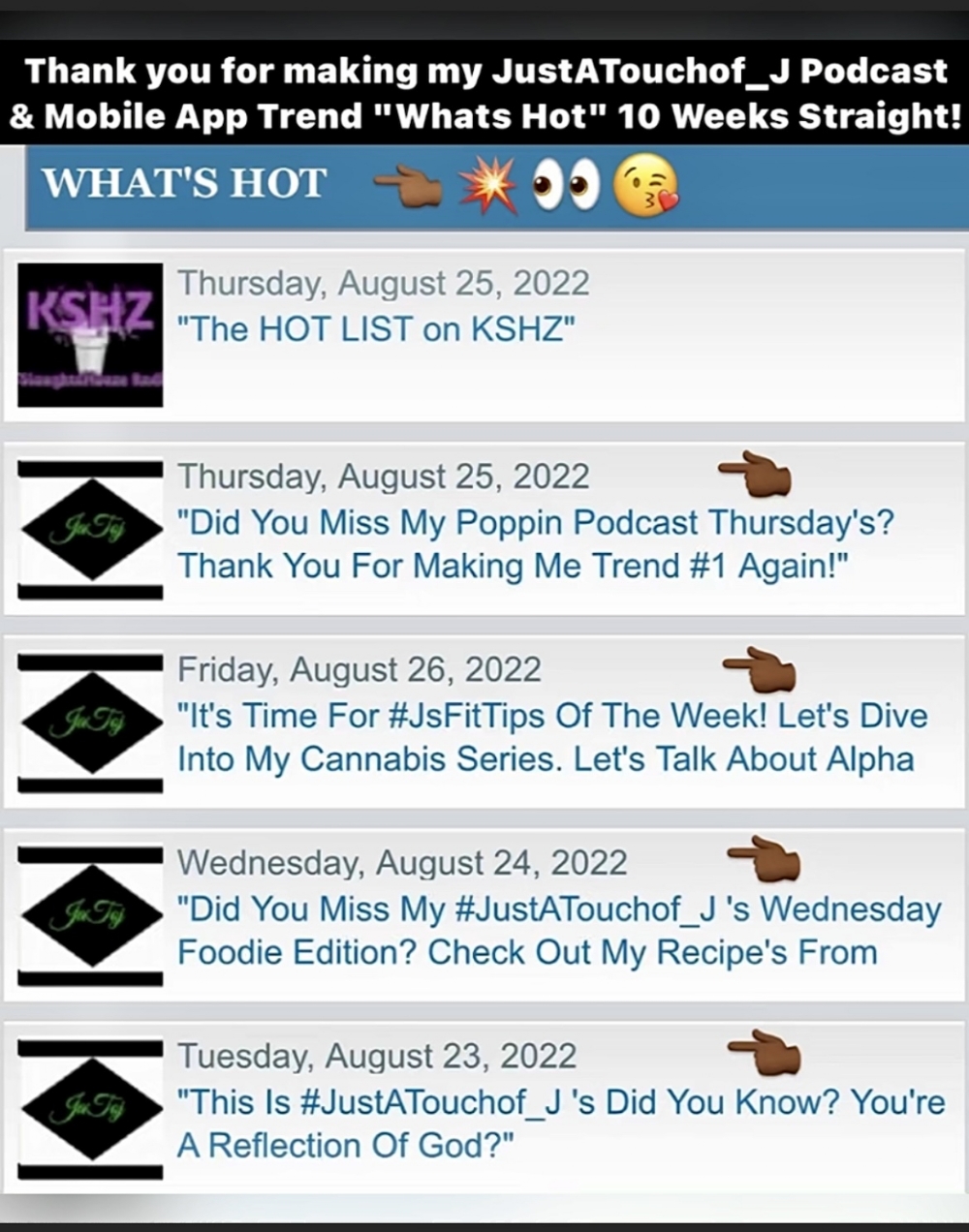 Did you miss my JustATouchofJ's Poppin Podcast Thursday's on my JustATouchofJ Mobile App, Instagrams, Facebooks, Tumblr, Twitter, TikTok, Snapchat, Reddit, LinkedIn, and Blackvibes.com just to name a few?
