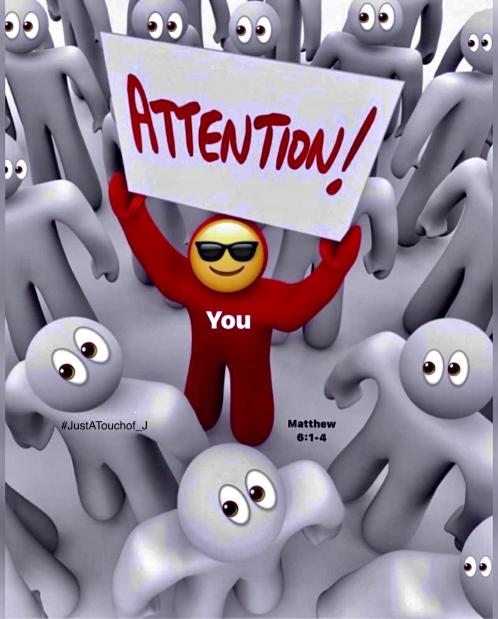 In other words. Do what you do unto God and not people. Understand that when you do things to be seen by others, you're never in control because they're. SMH.. you just gotta tell yourself the truth. You have to realize that you have deep rooted issues with self love when seeking attention fuels your identity.