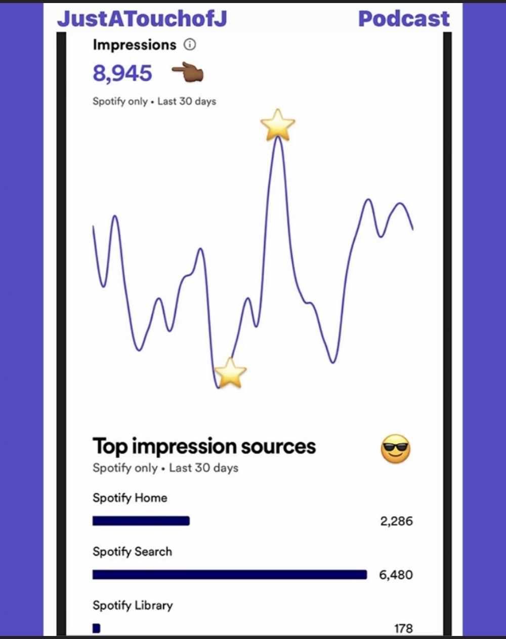Thank you for the over 150,000 Plays on my over all JustATouchof_J Podcast! Four weeks ago the total new "SPOTIFY" plays were 2.8k. Three weeks ago the new plays were 3.8k. Two weeks ago the new plays were 4.9k! Last weeks new plays were 7.3k! And this weeks plays were totaled at 8,945 for 30 days via Spotify. The numbers don't lie. My podcast is currently playing in over 150 different countries on over 50 podcast Networks Globally. You'll Rock!
