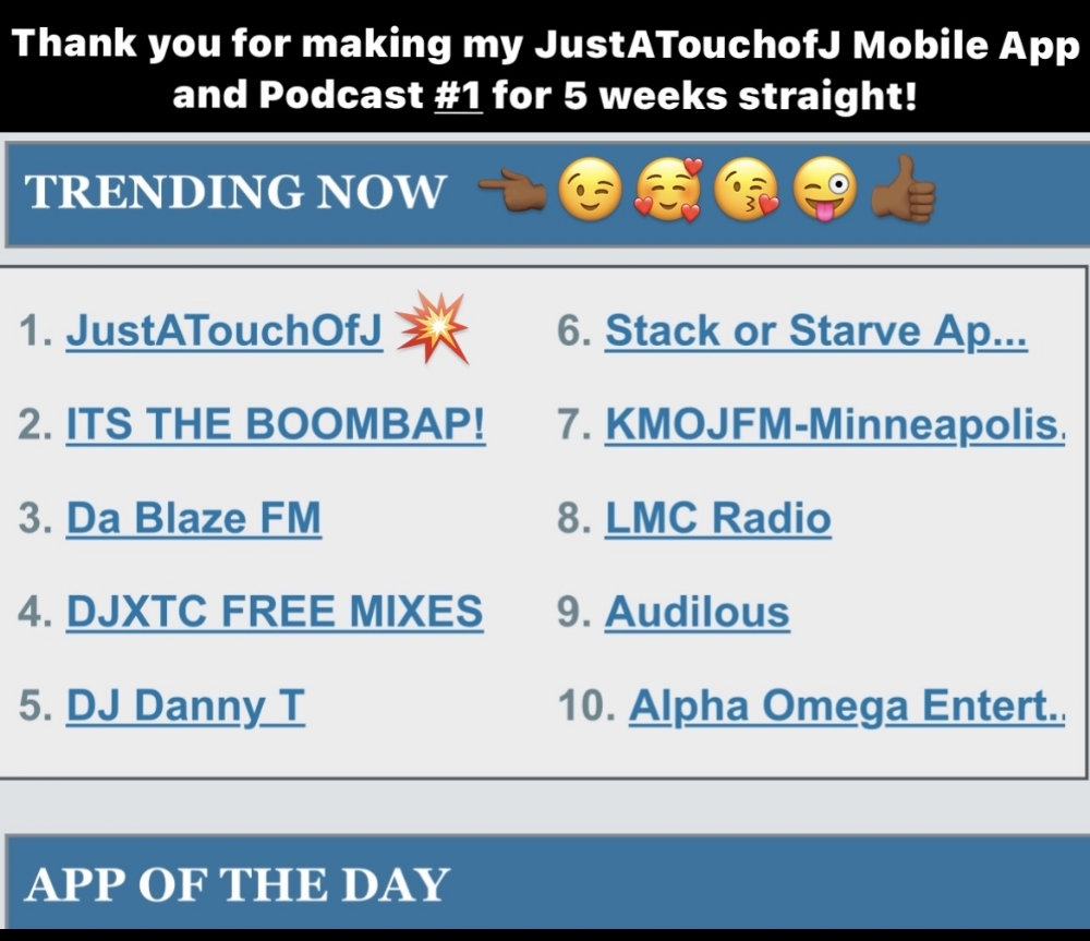 Thank you for making my JustATouchofJ Mobile App and my JustATouchof_J Podcast Trend #1 for 5 weeks straight!