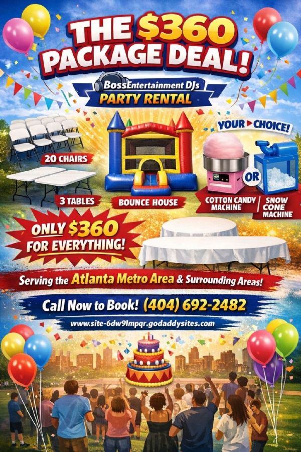 Check out my new party package deal that I am offering you so you can get 20 chairs 3 tables BounceHouse and also the Dj' one machine of your Choice Cotton Candy or Snow Cone machine for only $360 It's (This is The $460 package deal) for 5 hours Bossentertainment DJs Party rental we are servicing the whole Atlanta metro district and surrounding areas contact us for more information (404)692-2482 https://site-6dw9lmpqr.godaddysites.com