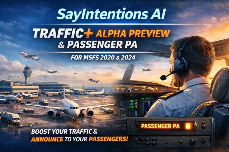 SayIntentions AI has released Traffic+ Alpha Preview for Partner users, adding higher traffic density in MSFS 2020/2024, plus a new Passenger PA intercom feature for enhanced immersion.